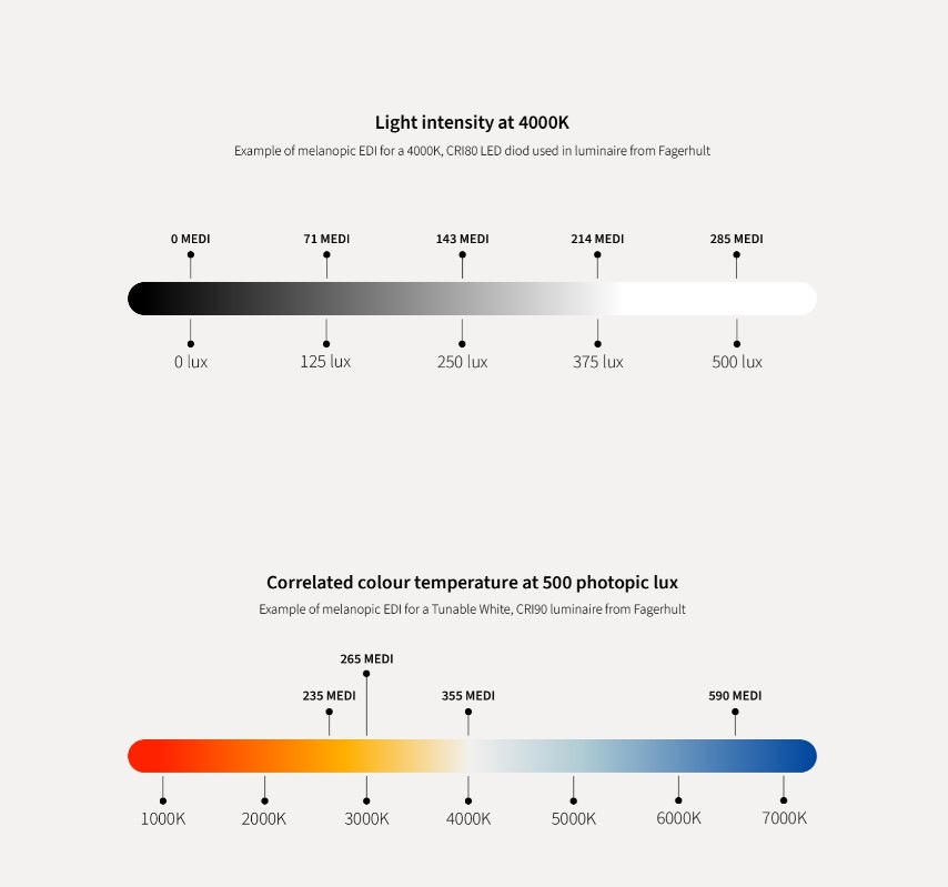 El cálculo de la luz melanópica se realiza multiplicando la intensidad de luz fotópica (la que usamos para ver) por el Ratio Melanópico de la fuente de luz. Dependiendo de la temperatura de color de la luz, el MDER variará. Por ejemplo, una luz con 4000 K tendrá un MDER de 0.57, mientras que una luz de 6500 K (más cercana a la luz natural) tendrá un MDER de 1.18.
